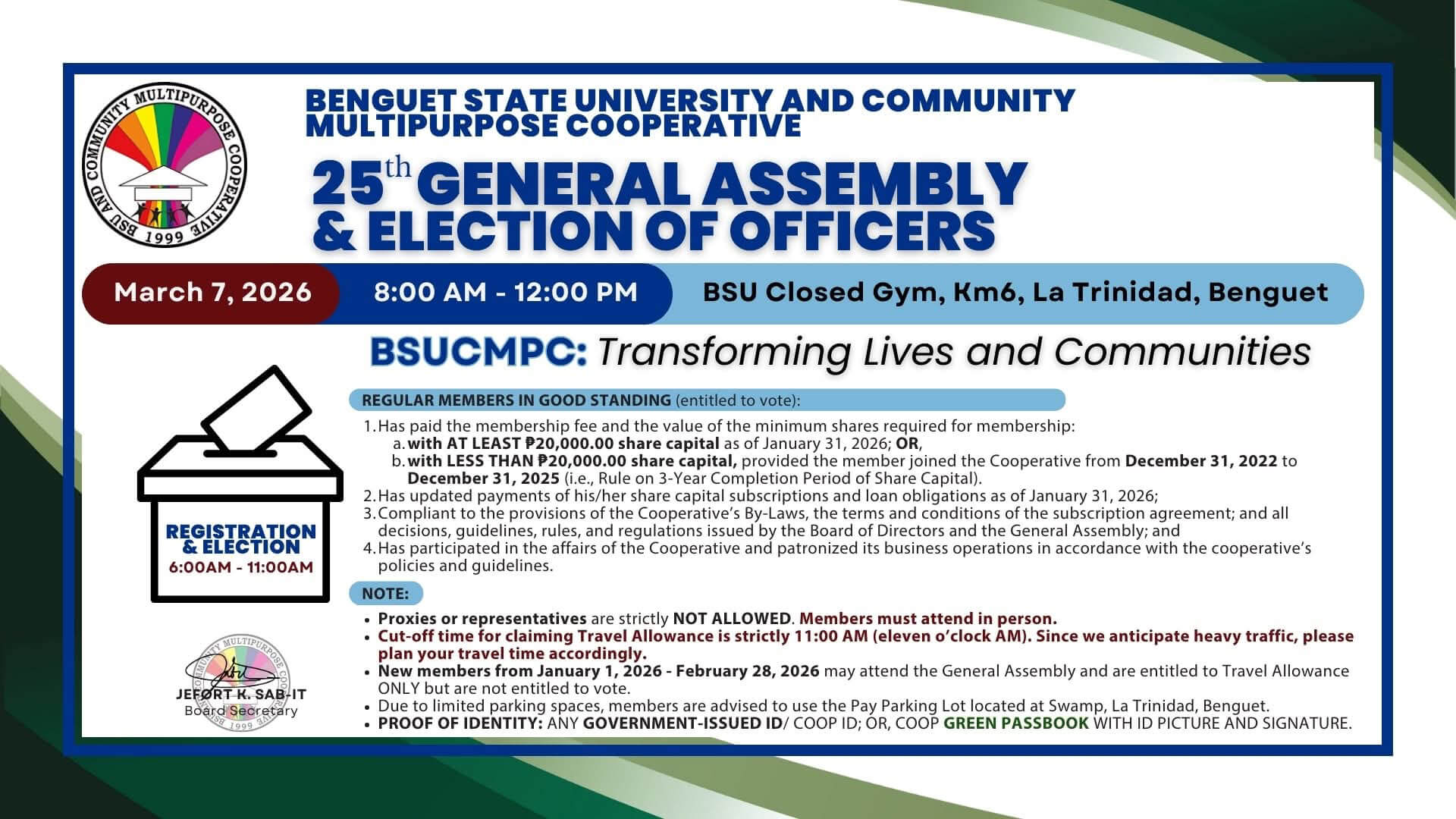 Available at our Bauko, Loo, (Buguias) and Main Offices