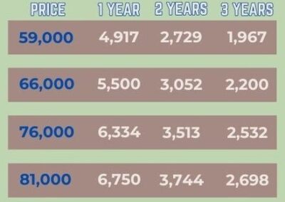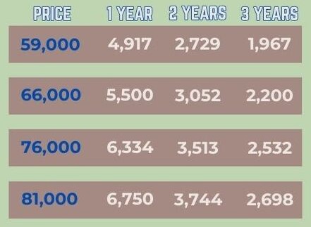 • Price per unit as follows if paid one time, total price applies; if loan availment selected amortization in the table (left) applies with a diminishing interest; no service fee and insurance charges.